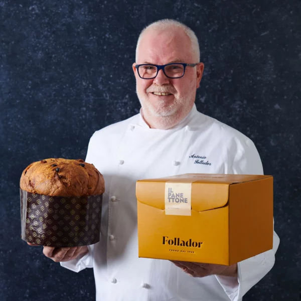 Da oltre vent’anni Antonio Follador lavora la pasta viva del lievito madre con la stessa passione del primo giorno, selezionando farine naturalmente robuste, burro da centrifuga, panna fresca e vaniglia Bourbon del Madagascar per dare vita a un pandoro dalla morbidezza inconfondibile e dalla fragranza avvolgente.